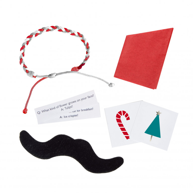 - В каждой есть красная, серебряная или розовая шляпа для вечеринок, самоклеющиеся усы, 2 праздничные наклейки и красно-белый браслет дружбы.